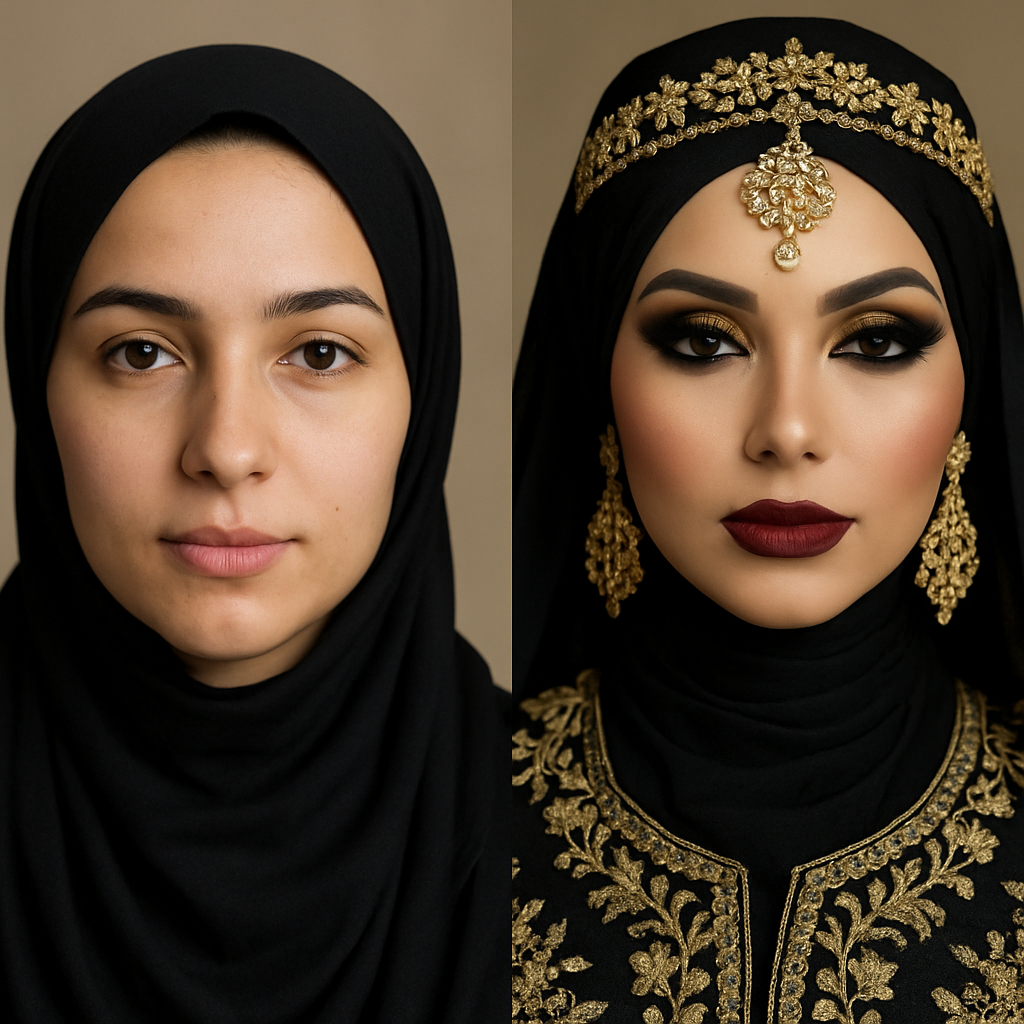 My artistry blends the elegance of African bridal culture, the richness of Middle Eastern beauty, and the soft radiance of Western glam.